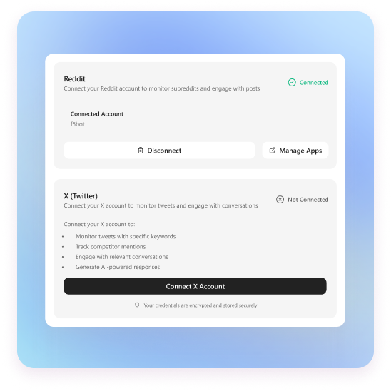Choose which subreddits or X accounts to monitor and set response generation thresholds. Apply platform-specific filtering rules to target exactly where your audience hangs out.