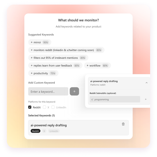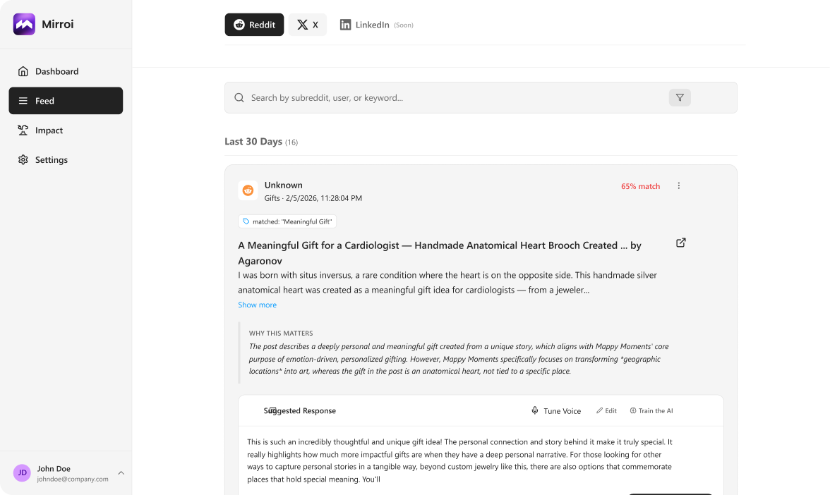Mirroi monitors Reddit (LinkedIn & X/Twitter coming soon) and filters out 95% of irrelevant mentions — then drafts replies that learn from your feedback.