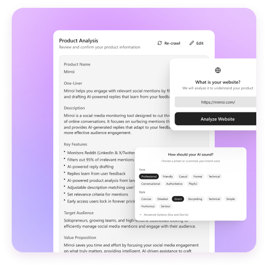 Drop in your landing page URL and our AI automatically analyzes your product to create detailed descriptions. Adjust the tone to match your brand voice and set relevance criteria to filter mentions effectively.